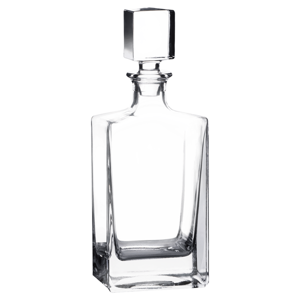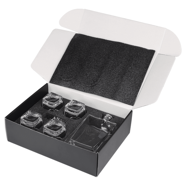 This decanter set includes a rectanlge decanter with a stopper lid and four 8 oz. rocks glasses. The decanter, lid, and glasses can be personalized. The set is packaged in a gift box with EVA foam protection.